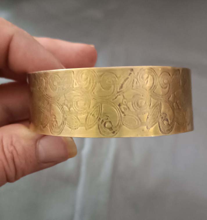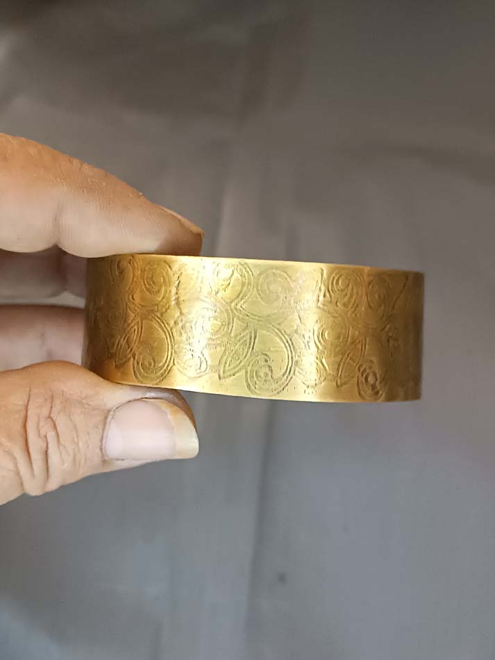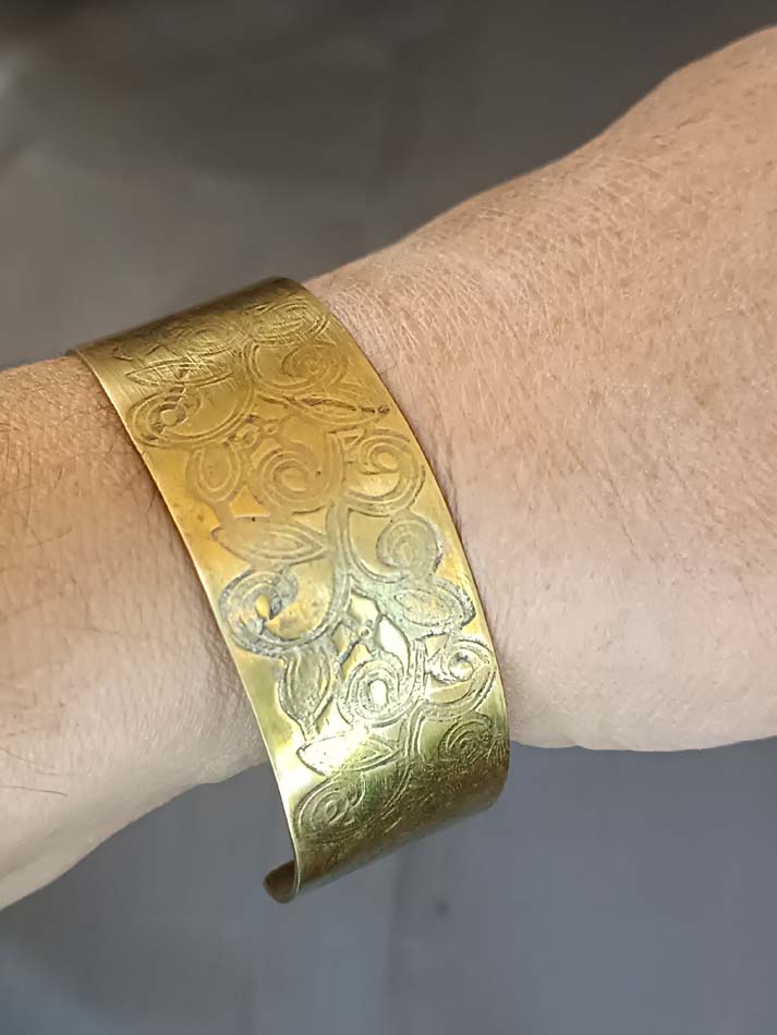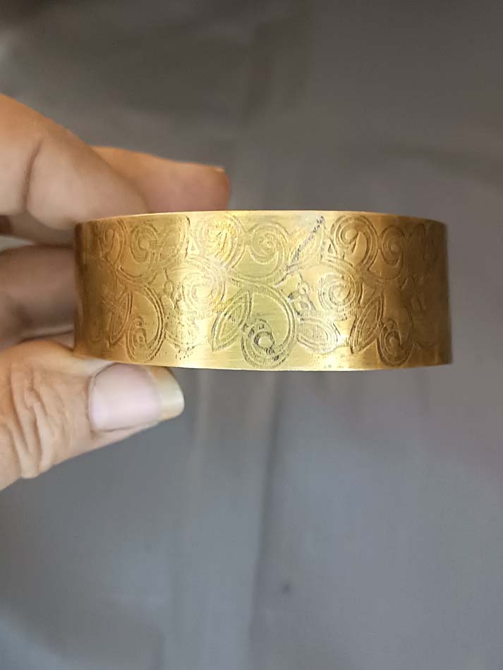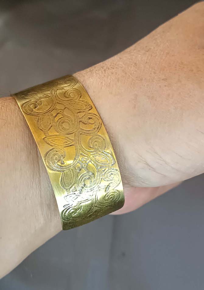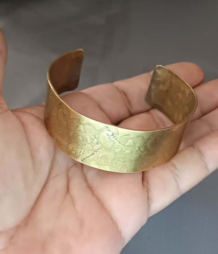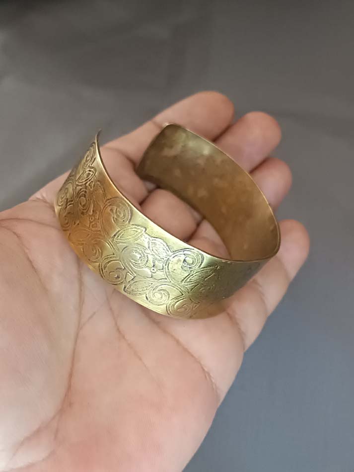 Divna mesingana narukvica sa interesantnim utisnutim šarama u metal. Klasičan oblik, lep dizajn, odličan kvalitet izrade i izuzetna udobnost prilikom nošenja su glavne oznake ovog modela narukvice.