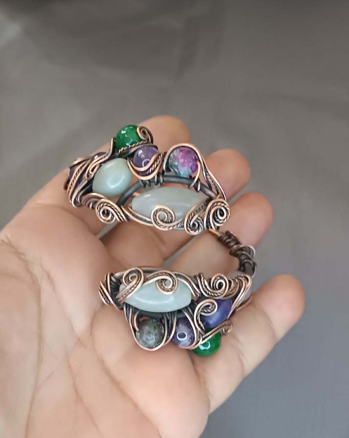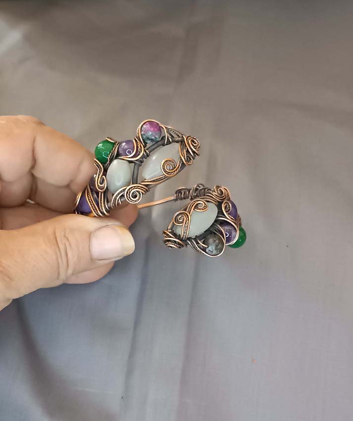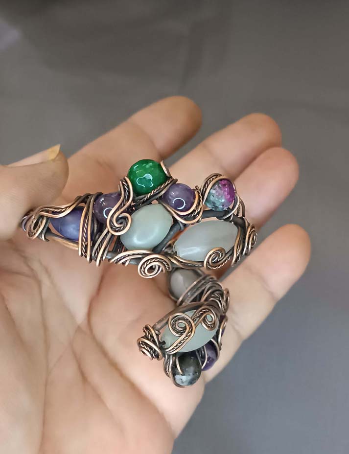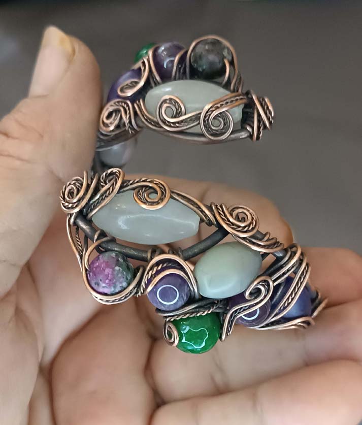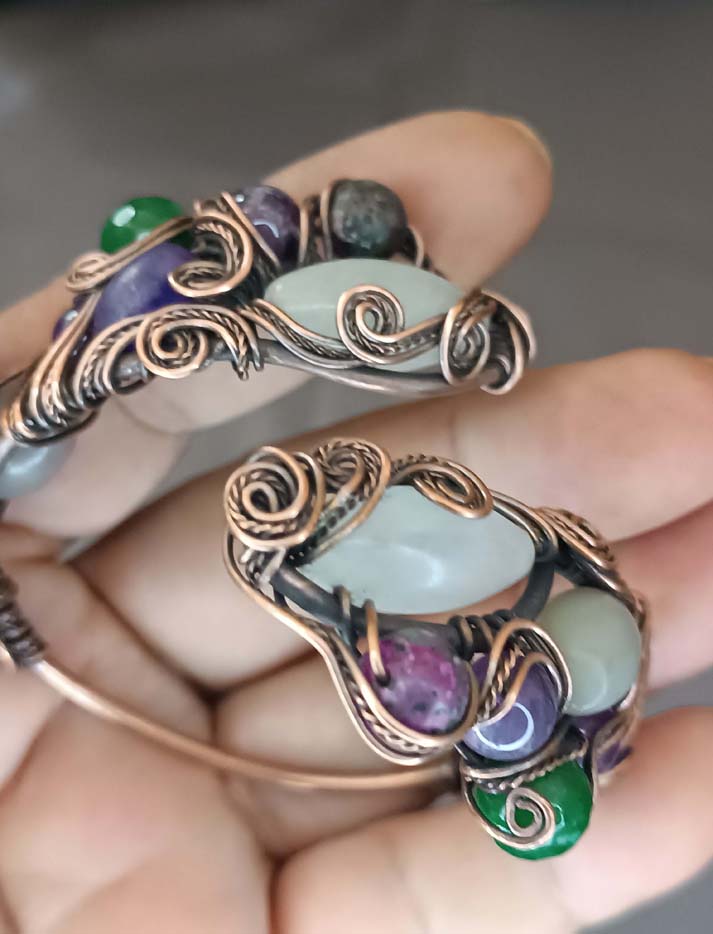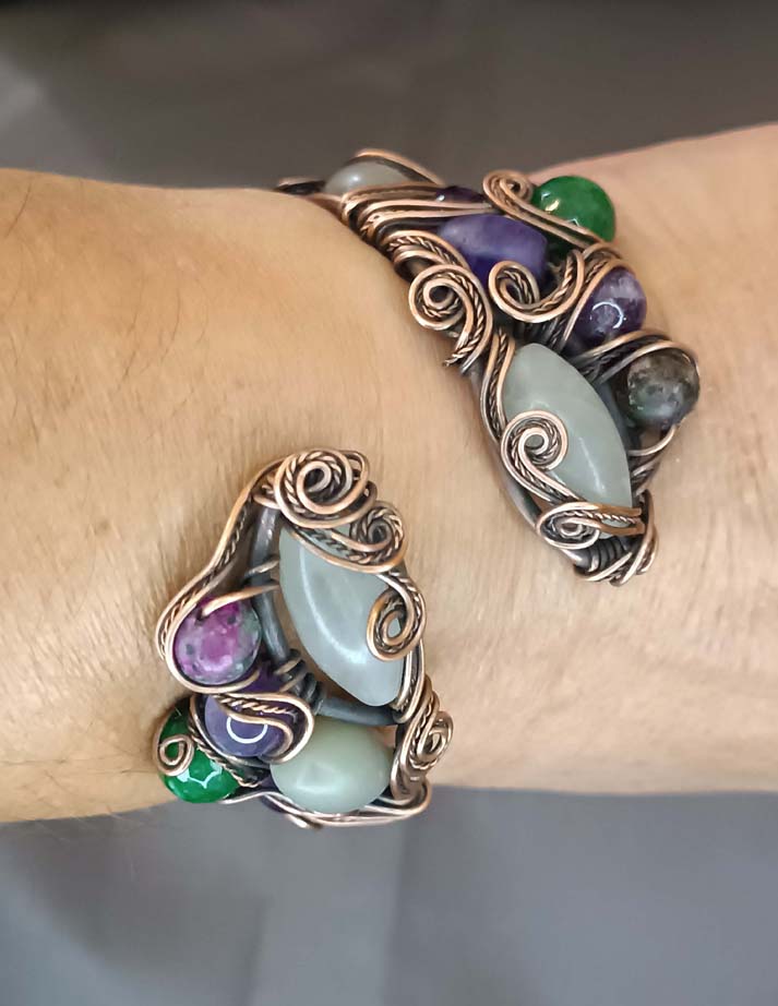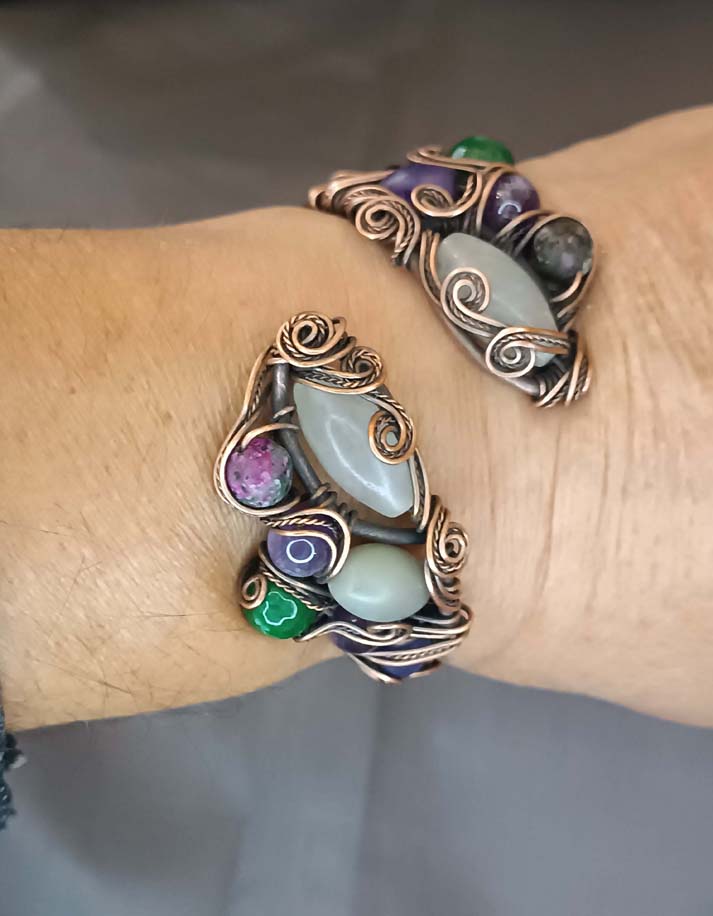 Za ovu narukvicu koristila sam: mlečni kvarc, ametist, žad, rubin u zoisitu, ljubičasti jaspis i kendi žad.
