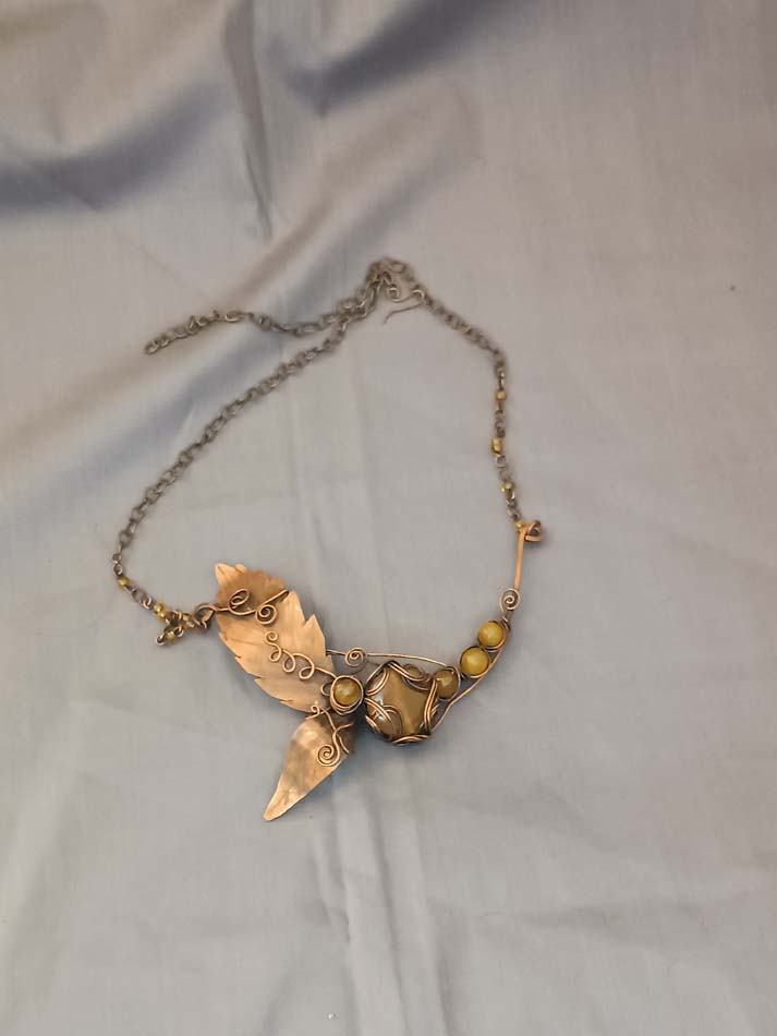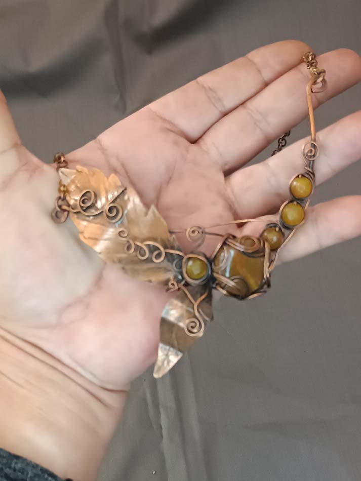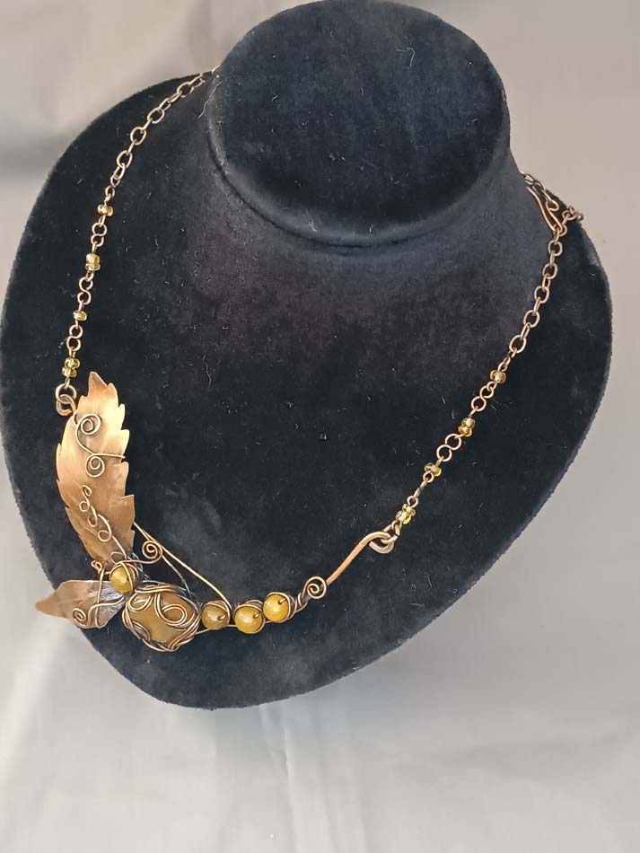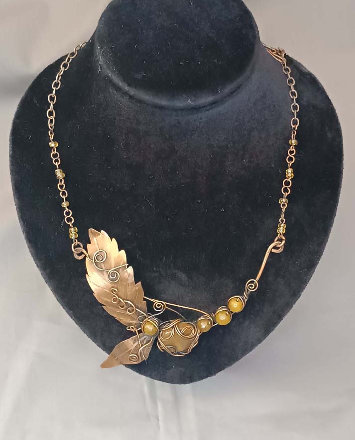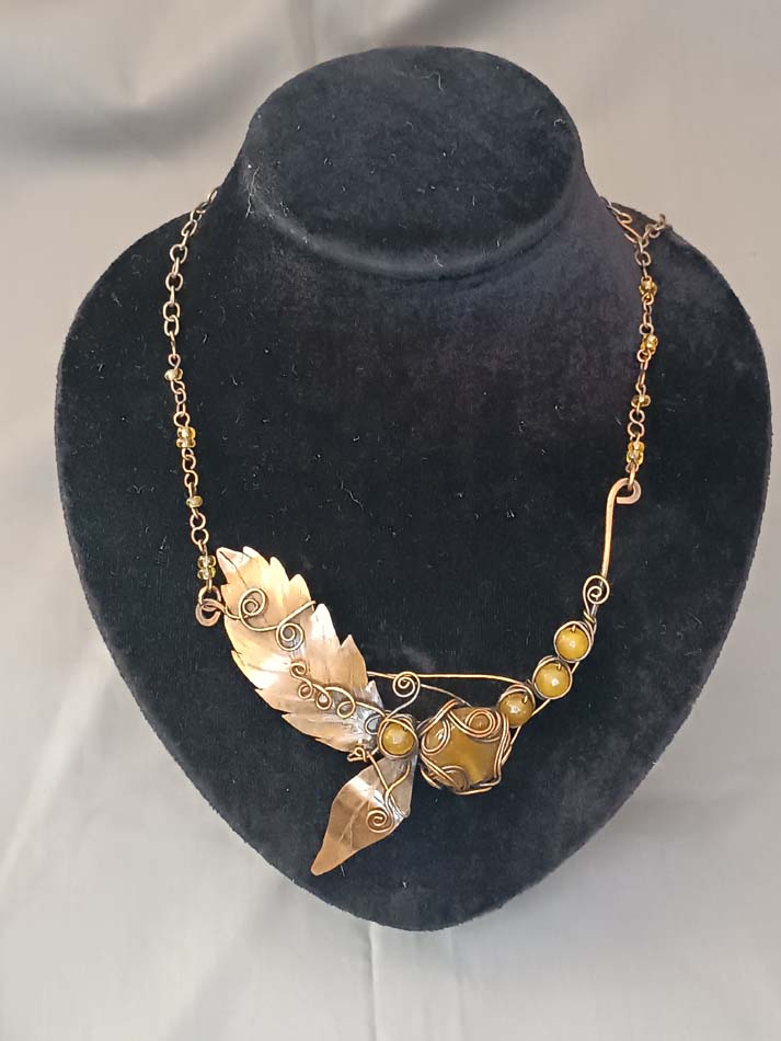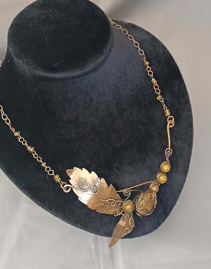 Prava jesenja ogrlica sa ručno rađenim listovima od bakarnog lima i perlama od žutog ahata.