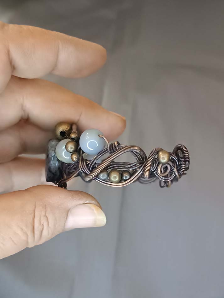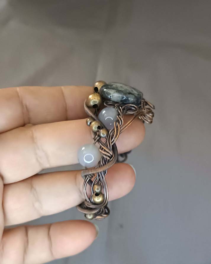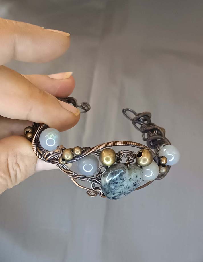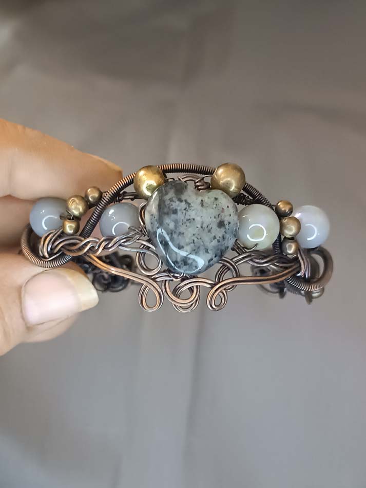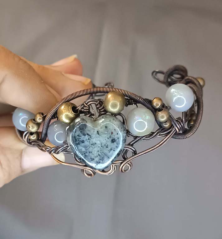 Neobična, slatka, sa srcolikim sodalitom u centralnom delu i nekoliko perlica sivog ahata kao dekoracija. Jako lep rad od žice daje poseban šarm celoj narukvici.